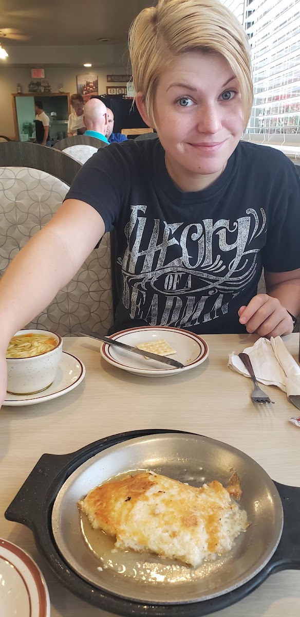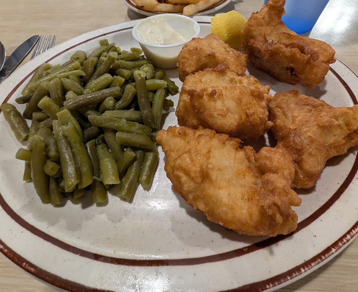 Came in Friday and tried the fish all you can eat. Very good,and cooked well. Generous portion. Breading light and not greasy. The side of green beans tasted like from a can,but ok. Side soup is good. Generous portion of fish. Very nice and clean dining area. There are lots of windows and bright light. Our waitress was awesome and attentive. This is a nice hometown type restaurant.